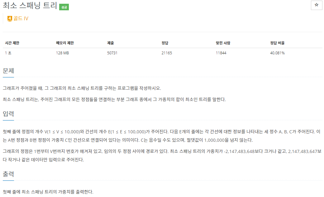 백준 1197번 최소 스패닝 트리 C++